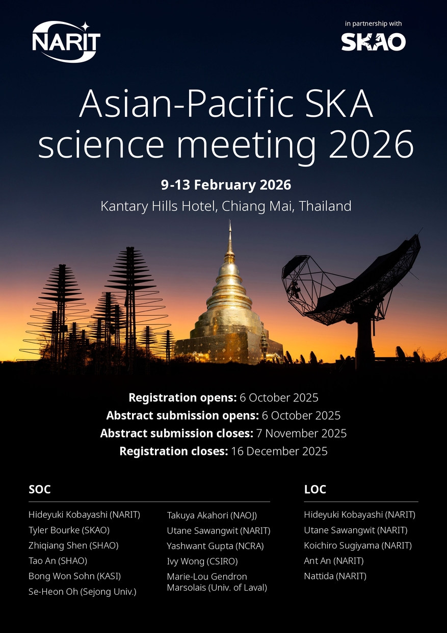 Construction of the SKA is progressing smoothly in South Africa for the Mid telescope and in Australia for the Low telescope. In past, regional workshops have been held in Asia to foster future research collaboration, technological development, and SRC development cooperation for the SKA. This time, a workshop will be held in Chiang Mai, Thailand to discuss research collaboration in the Asia-Pacific region. We look forward to the participation of many researchers, engineers, and students.